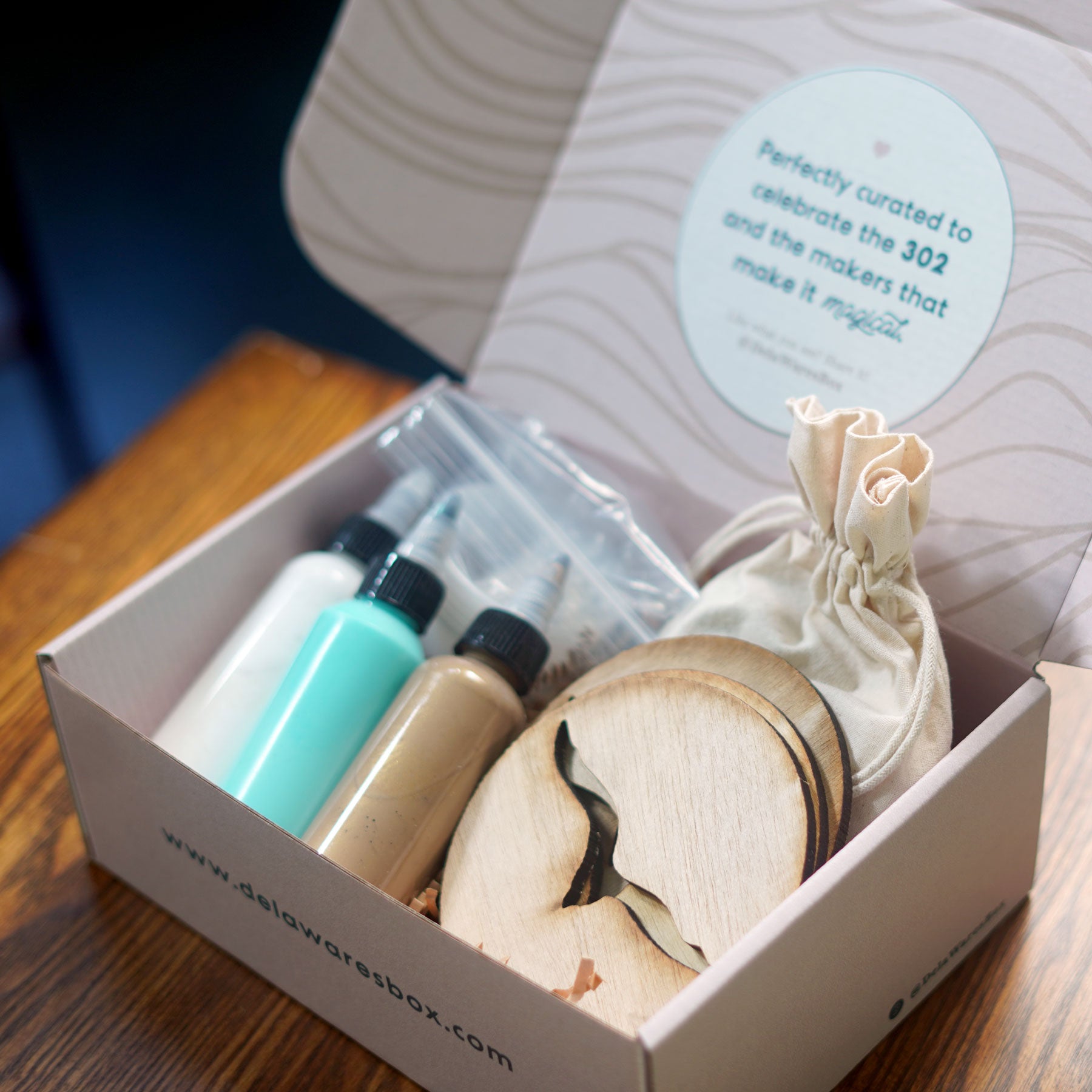 We teamed up with our friends at Delaware Artist Collaboration to bring a little DIY 302 magic to your table with this all-in-one craft box! Perfect for beginners and makers of all ages, this (very giftable!) kit includes everything you need to design your own set of three wooden coasters using a paint-pour technique—no additional supplies required. Just open the box, pour, swirl, and let your creativity flow!